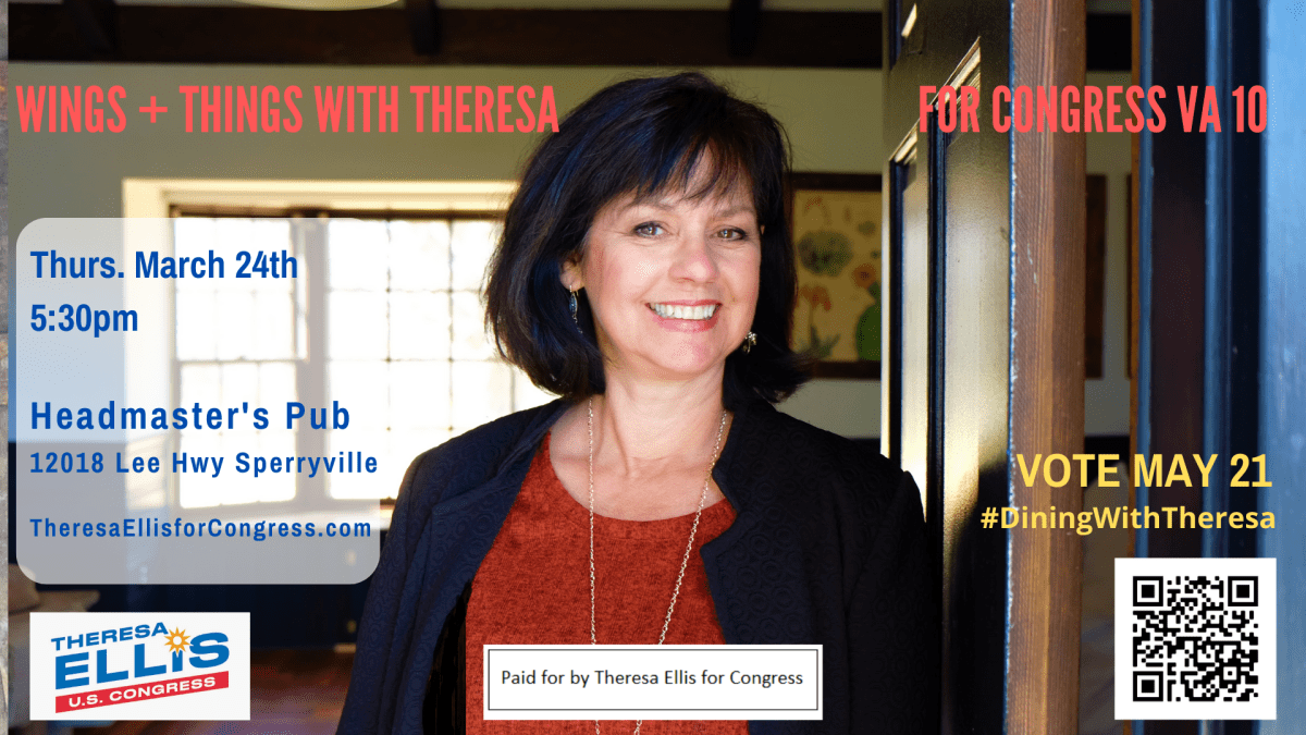 Want to see some beautiful landscape in Virginia’s 10th District! Join us for yummy wings and things at a local favorite Headmaster’s Pub in Rappahannock County! Meet Theresa Ellis for Congress VA 10 and learn about the upcoming VOTE on May 21st at the Firehouse Primary — NEW LOCATIONS.